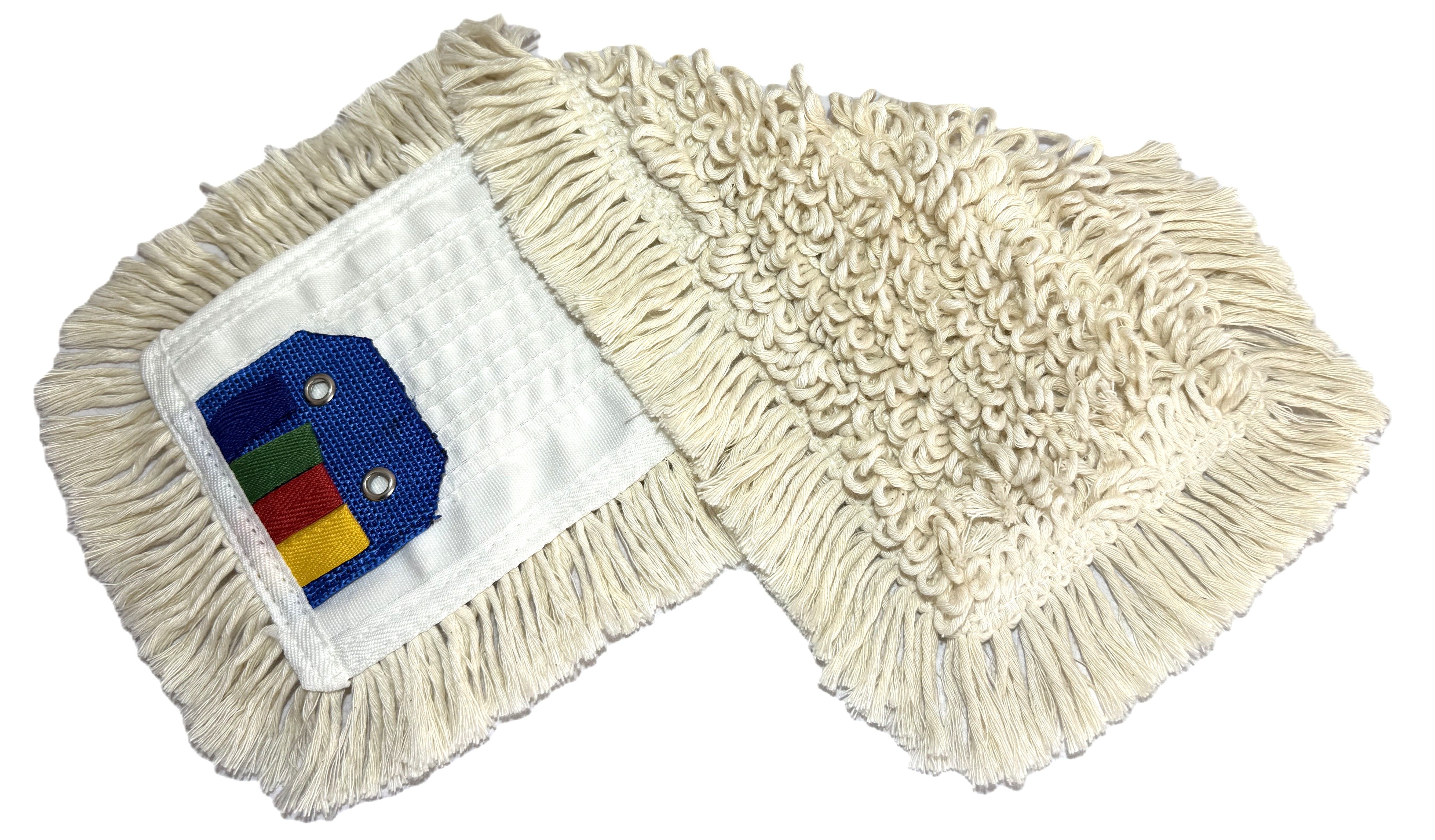 Bavlněný jazykový mop s velmi hustou přízí. Stříhané okraje a pevné prošití. Lze prát na 90°C. Jazyky z pevného syntetického materiálu s dvěma kovovými kroužky na velmi pevné zajištění mopu v klapce držáku.